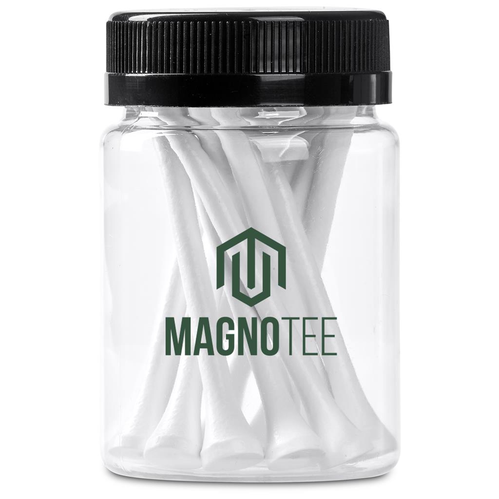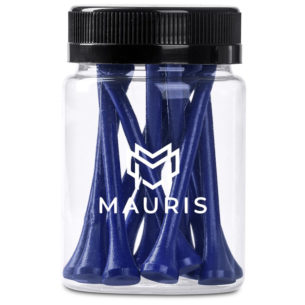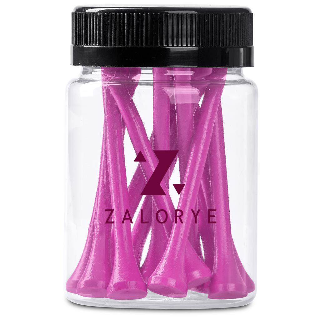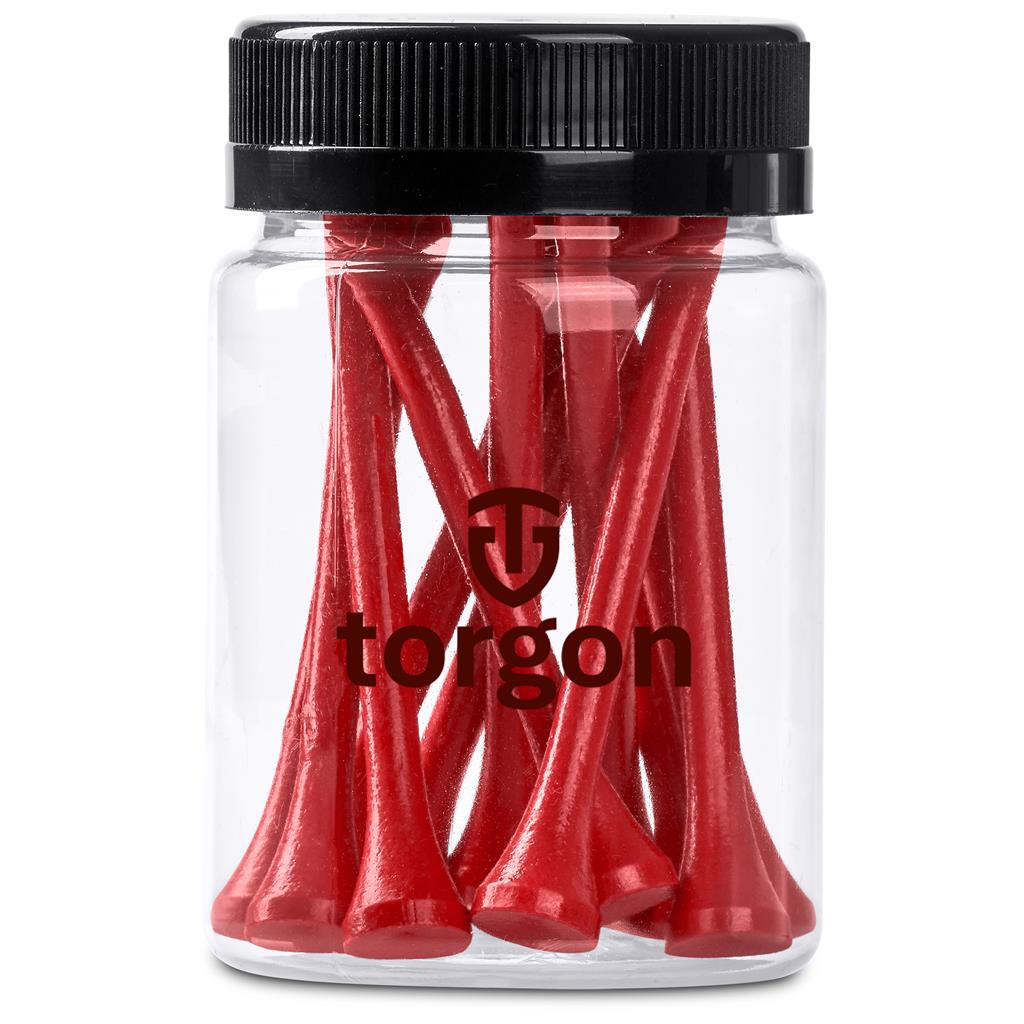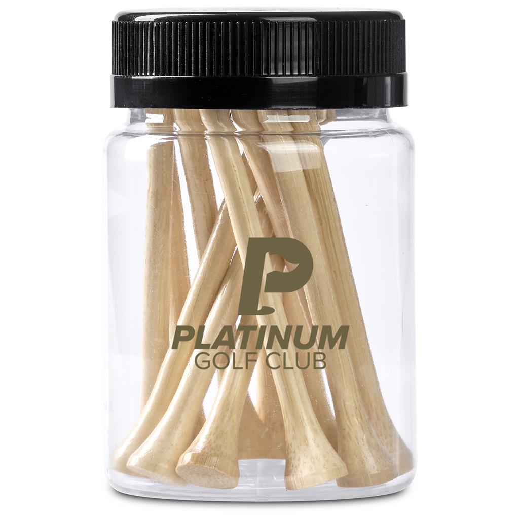 a handy giveaway for golf events: 12 wooden tees in a reusable plastic jar.