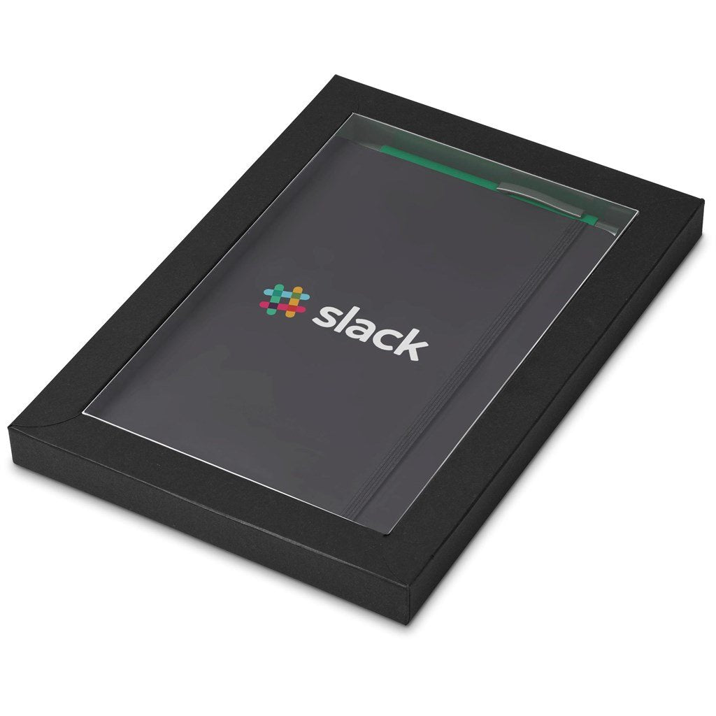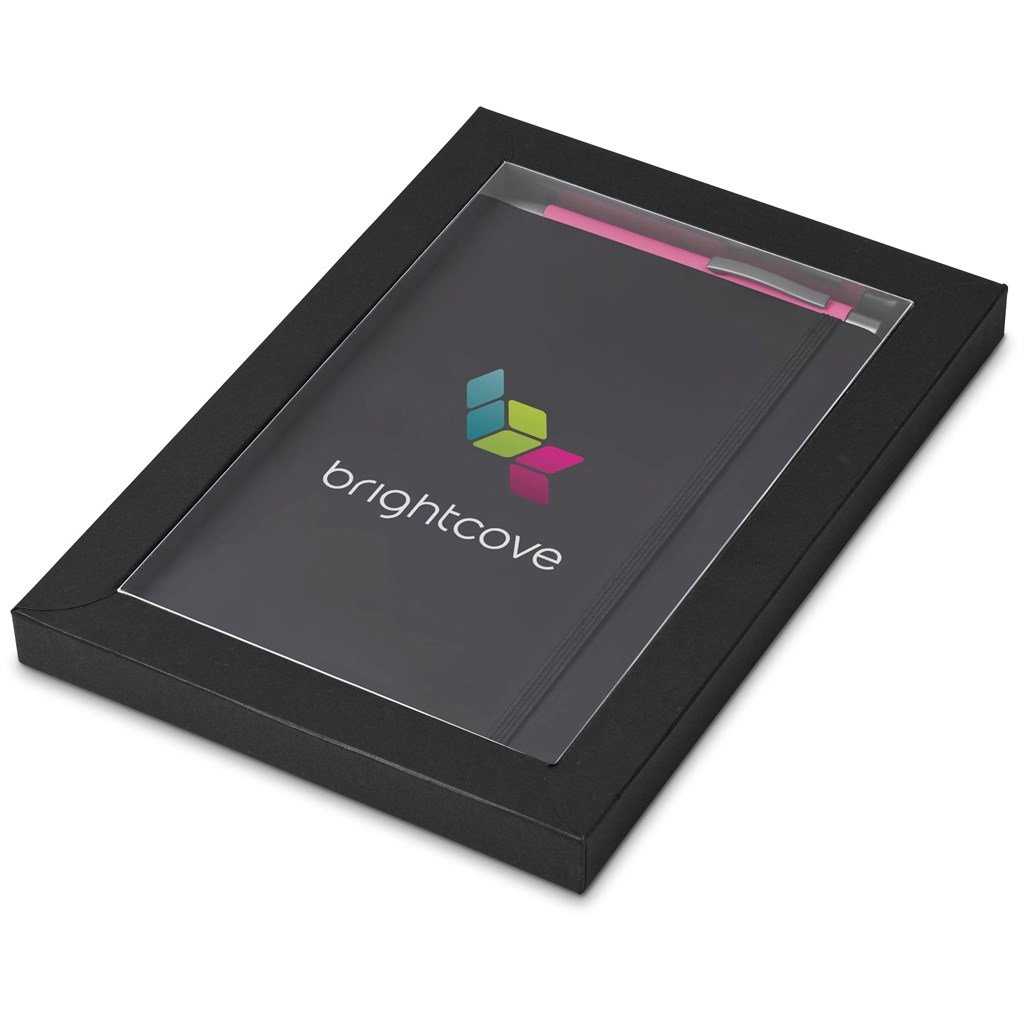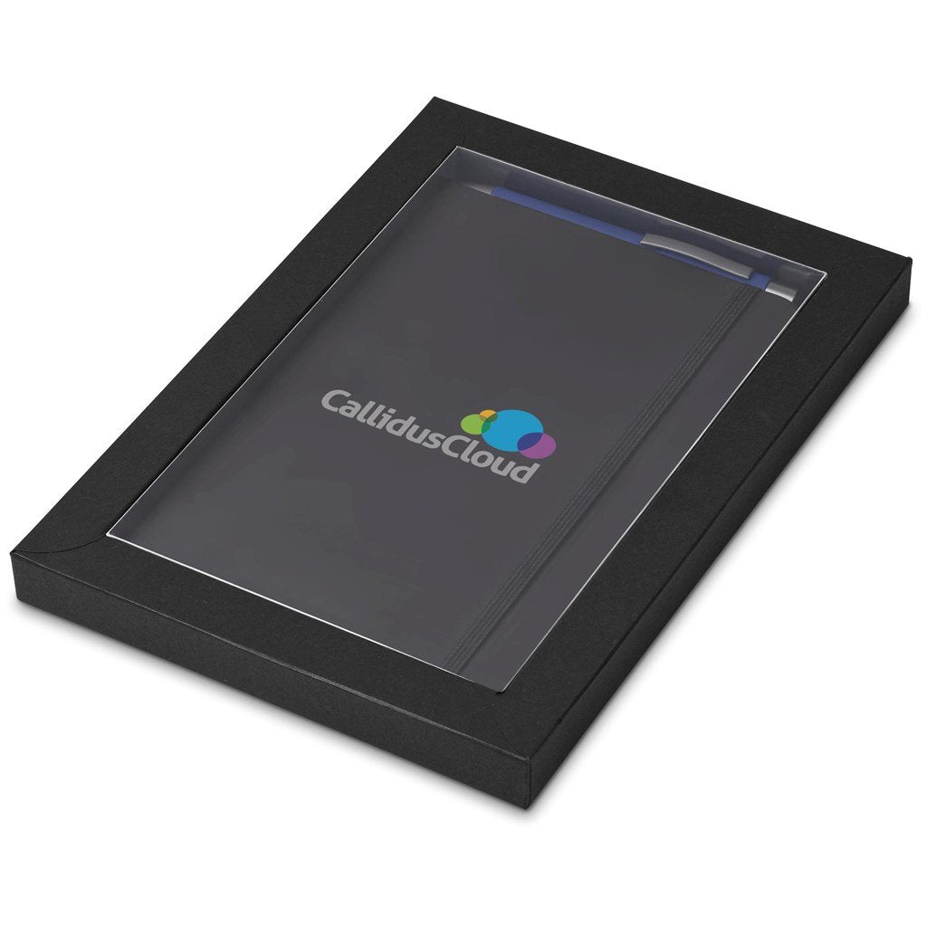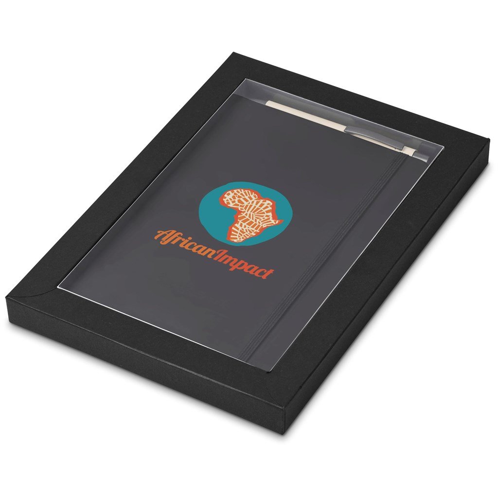 a black omega a5 hard cover notebook and an omega ball pen in your choice of colour are packaged together in a box which provides bright and clear exposure for your branding. The box has a firm cardboard base, and a transparent acetate lid.