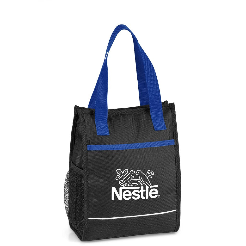 Bright and trendy. Main zippered compartment with silver PEVA lining. Front slip pocket with colour trim. Side mesh water bottle pocket. Small I.D window at the back of cooler. Colour accented double carry handles.